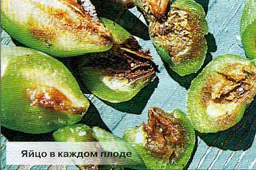 Совсем иное поведение у самок. Наевшись сполна гнилой мякотью ранее испорченного плода и основательно «зарядившись» спорами плодовой гнили, самка своим длинным «носом» прогрызает очередной здоровый плод и откладывает в него яйцо. Но это еще полдела! Всю прогрызенную для откладки яйца полость самка закупоривает своими экскрементами. Это «запрограммированная» пакость в отношении плода и, конечно, садовода. Помните, чем перед своей «напряженной работой» заправлялась самка? Так вот, все эти споры плодовой гнили в пищеварительном тракте казарки не перевариваются, а только дополнительно размножаются. Поэтому живую ранку плода самка «пломбирует» такой инфекционной смесью, которая сразу же вызывает его гниение. Отродившаяся из яйца личинка тоже питается не свежей мякотью плода, а только гнилой.